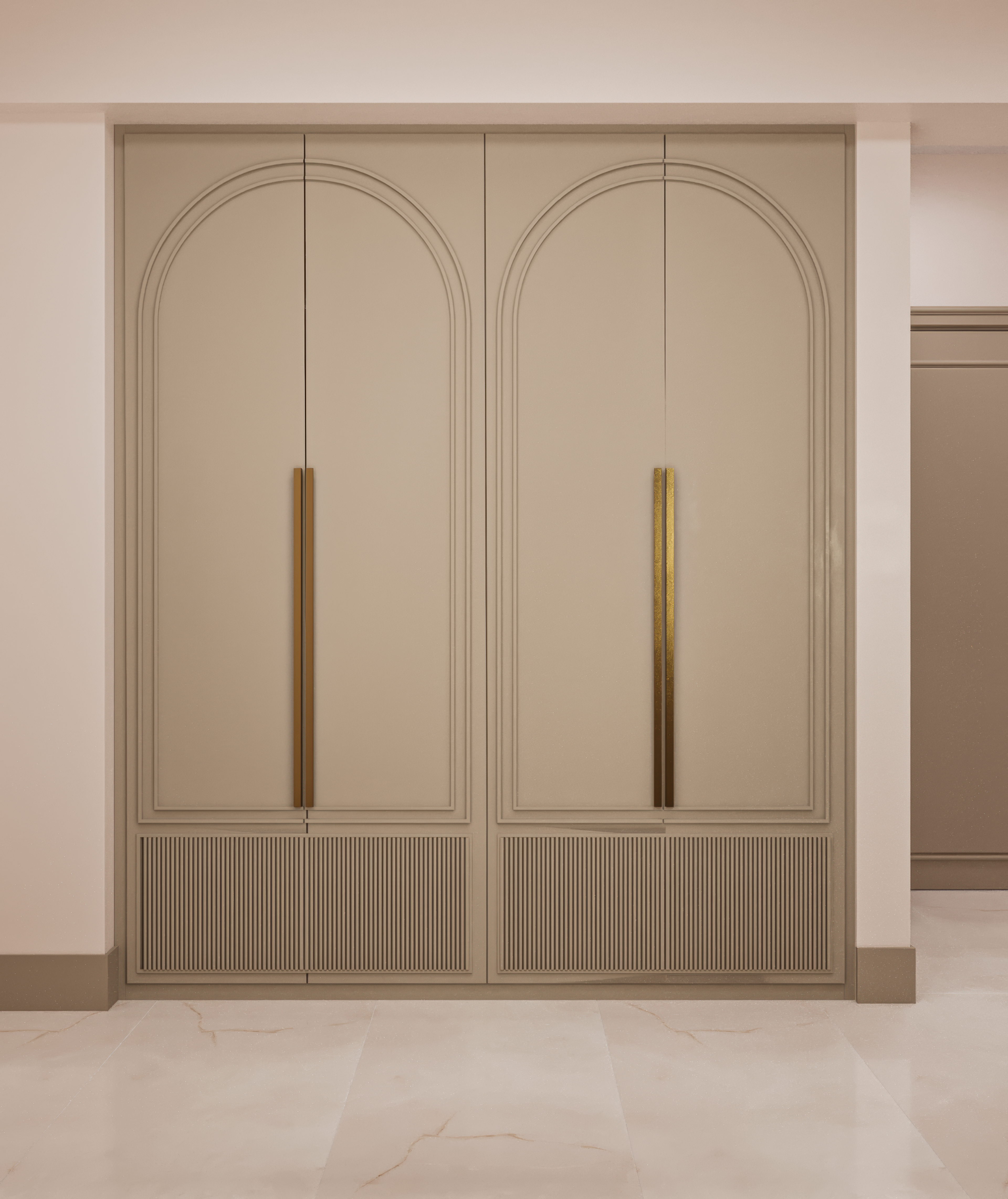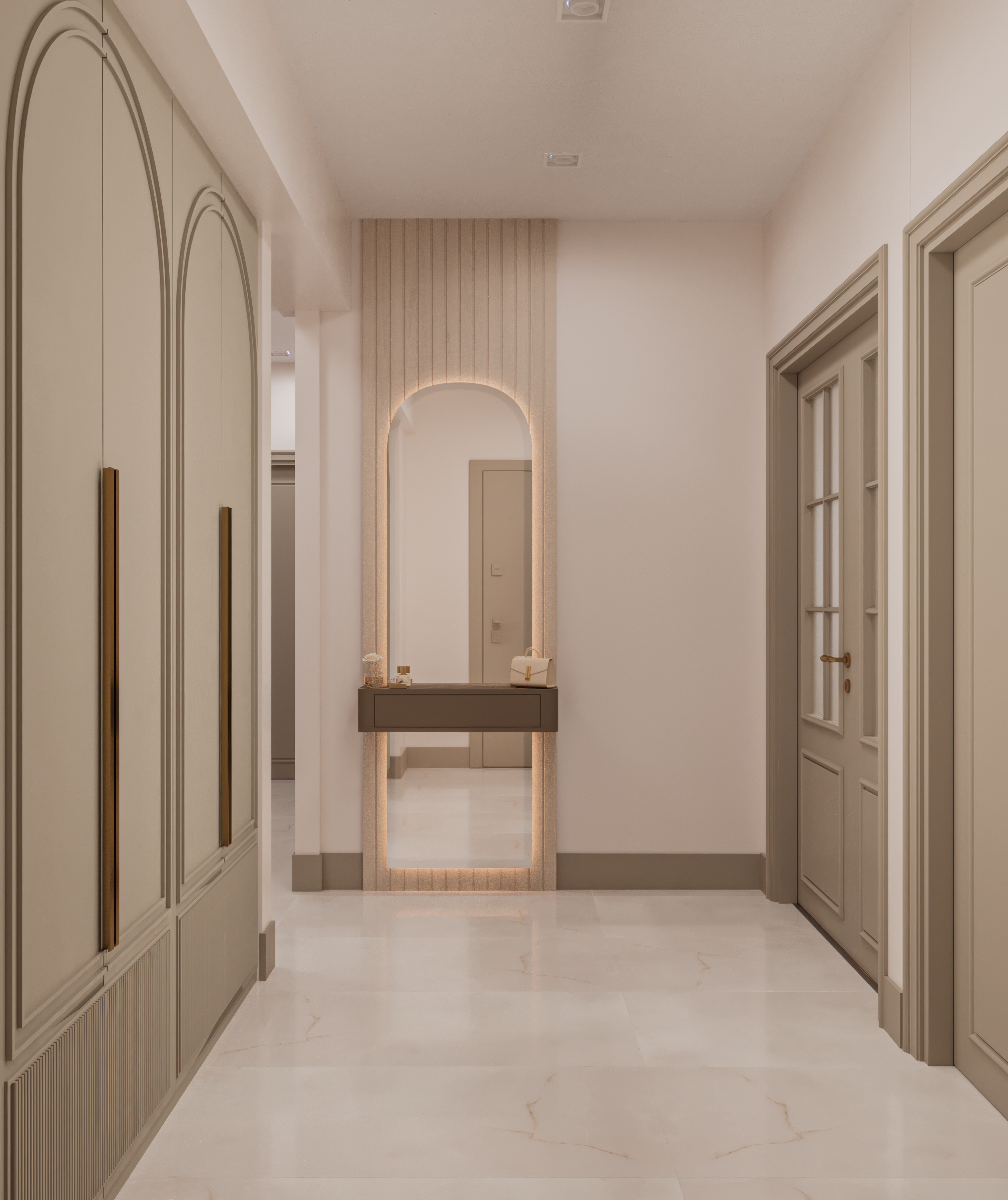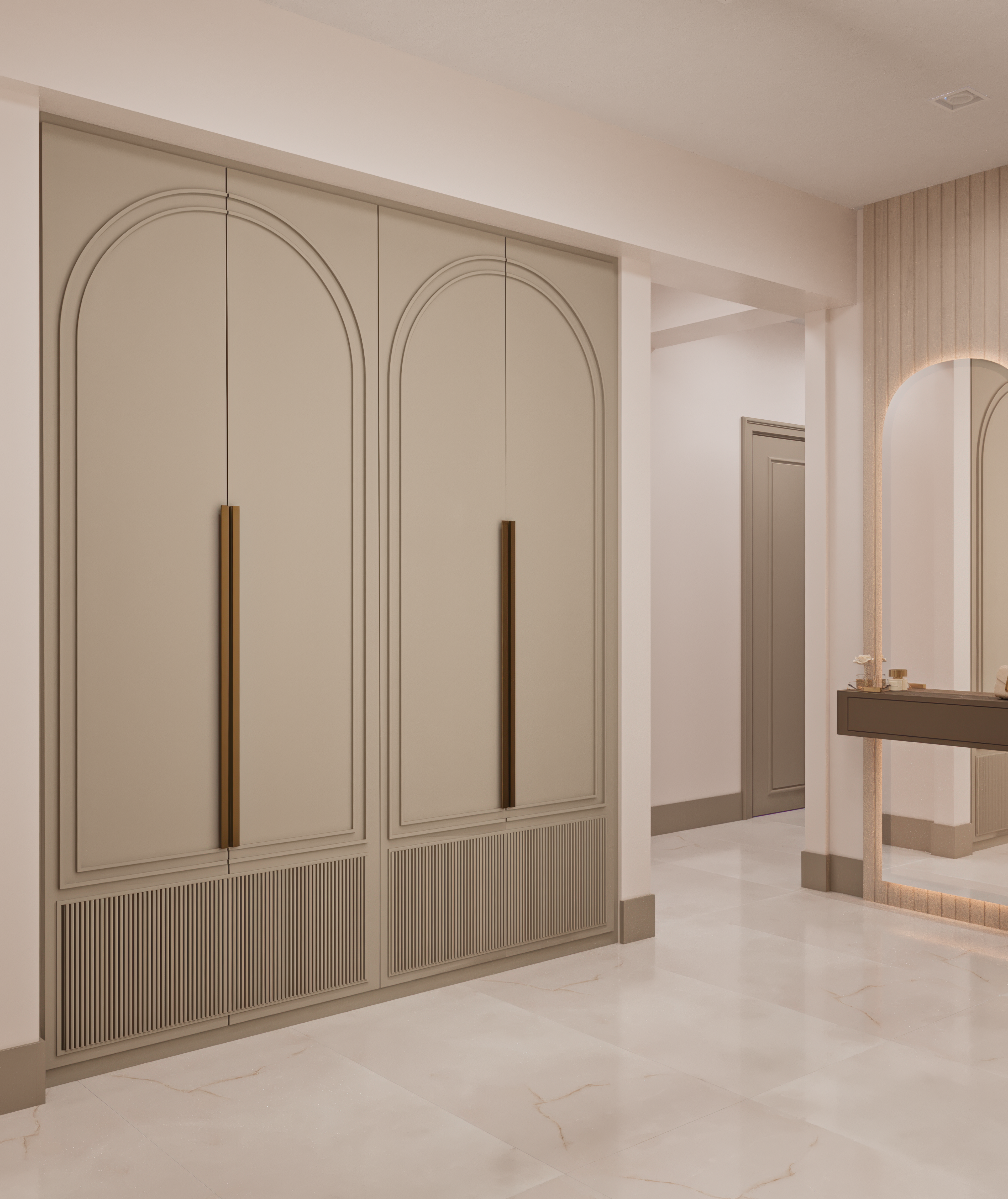 This project focuses on creating a warm and elegant entrance area through soft color tones, arched cabinet details, and minimal yet striking handles. The combination of modern lines and functional design provides both practicality and aesthetic harmony.